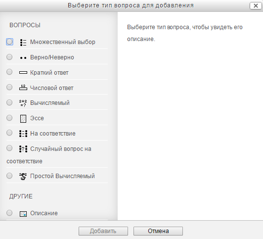 Нажав кнопку «Добавить» можно добавлять как случайные вопросы из определенной категории, так и конкретные вопросы из банка вопросов.