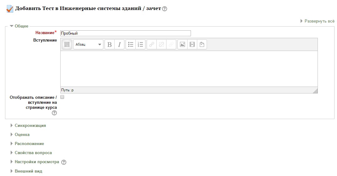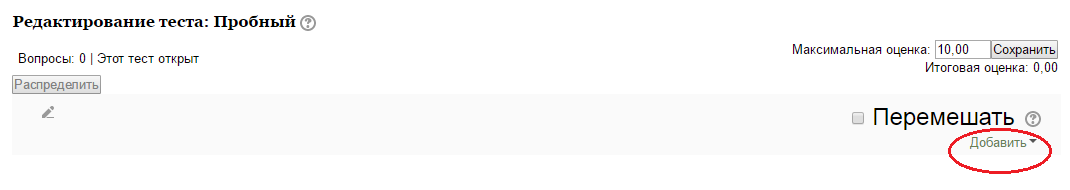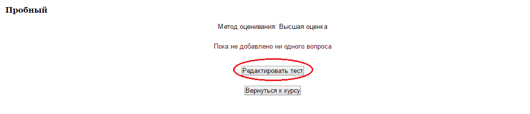 Затем нужно наполнить созданный тест вопросами из Банка вопросов. На главной странице курса в режиме редактирования щелкните по названию теста. Откроется страница редактирования теста (Рис.5).