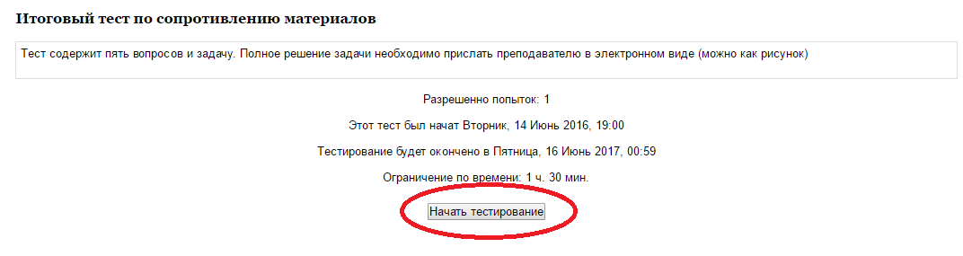 Перед прохождением теста необходимо внимательно изучить инструкцию, в которой указывается время тестирования, количество попыток, способ оценивания и другая информация. Если тест имеет ограничения по времени, то при попытке выйти из теста или закрытии браузера время не остановится. Для того чтобы приступить к прохождению теста, необходимо нажать кнопку «Начать тестирование» (Рис. 1).