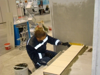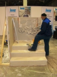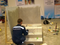 В ходе заключительного этапа конкурса в выставочном павильоне Новосибирского Экспоцентра на площадке в 240 кв.м., оформленной компанией КНАУФ, участники выполняли практическое задание «Фрагмент текущего ремонта подъезда». Мастера выполняли оштукатуривание стен макета смесями КНАУФ-Ротбанд и КНАУФ-Диамант, облицовывали ступени напольной плиткой с помощью клея КНАУФ-Флизен.