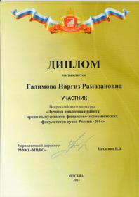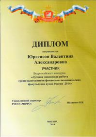Выпускники кафедры ПФУ впервые стали участниками этого значимого конкурсного мероприятия. Было представлено 11 дипломных работ, каждая из которых получила высокую оценку конкурсной комиссии, в состав которой вошли представители профессионального финансового и научного сообществ. Выпускники кафедры и их научные руководители были отмечены дипломами участника Всероссийского конкурса «Лучшая дипломная работа среди выпускников финансово-экономических факультетов вузов России – 2014».