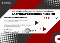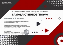 Благодарственными письмами организаторов девятого сезона Всероссийского Конкурса выпускных квалификационных работ «Городские Драйверы» награждены ректор НГАСУ (Сибстрин) Юрий Сколубович, доцент кафедры АРГС Антонина Крутухина, старший преподаватель кафедры АРГС Наталья Боровикова, профессор кафедры АРГС Аркадий Мордвов.