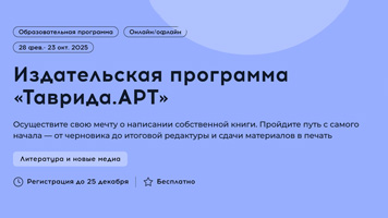Продолжается регистрация на «Издательскую программу «Таврида.АРТ» С 28 февраля по 23 октября 2025 года в Академии творческих индустрий «Меганом» будет проходить «Издательская программа «Таврида.АРТ @tavrida_art ». Она будет состоять из нескольких этапов, включая онлайн- и офлайн-форматы. К участию приглашаются авторы, пишущие в жанрах и интеллектуальной художественной литературы. В ходе программы совместно с мастерами индустрии участники пройдут все основные этапы работы с произведениями: от написания синопсиса до создания готового проекта с итоговой редактурой и сдачей его в печать. Авторы сформируют свой индивидуальный стиль, научатся вести историю от завязки до финала и создавать запоминающихся персонажей. |