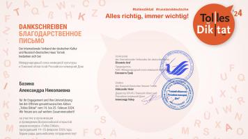 Всероссийский диктант по немецкому языку в НГАСУ (Сибстрин) С 19 по 25 февраля 2024 года в 12-й раз проходила Всероссийская открытая акция «Tolles Diktat» по инициативе общественных организаций российских немцев с целью популяризации немецкого языка и развития культуры грамотного письма на немецком языке. Наш университет участвовал в этой акции в качестве открытой площадки, на которой все желающие могли написать диктант и еще раз проверит свои знания этого иностранного языка. Ответственной за проведение данного мероприятия в НГАСУ (Сибстрин) выступила старший преподаватель кафедры Иностранных языков Александра Базина, она же и читала текст диктанта. |