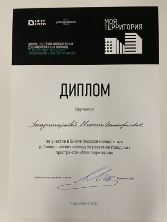 Студентка группы 400з Владимирова Евгения приняла участие в проекте, реализованном при грантовой поддержке Федерального агенства по делам молодежи (Росмолодежь), Школа лидеров молодежных добровольческих команд по развитию городских пространств «Моя территория».
