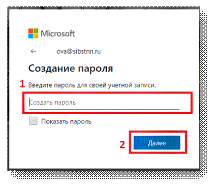 3. Далее введите пароль для новой учетной записи Microsoft (1) и нажмите Далее (2):
