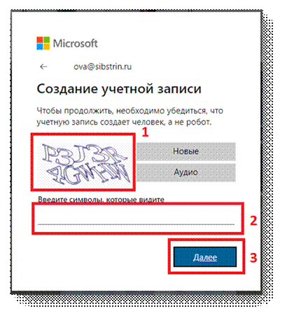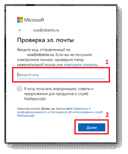4. Для подтверждения вашей электронной почты на нее будет отправлено письмо во время регистрации. Необходимо открыть входящие письма в своей корпоративной почте (@sibstrin.ru или @edu.sibstrin.ru) и найти входящее письмо от Службы технической поддержки учетных записей Майкрософт. В нем будет код безопасности – его необходимо ввести в форму (1) и нажать Далее (2):